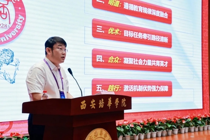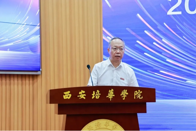 姜波理事长在讲话中深刻剖析了当下高等教育的发展现状,阐明了应用型本科高校的发展秘诀,向与会人员详细地介绍了培华产业学院建设的构想。他诚恳地邀请更多企业参与到学校的产业学院建设中,为本科教育教学注入新动能和不竭活力,鼓励全体培华教职员工破除旧思维、大刀阔斧改革,立足校内、牵手更多企业,打造人才培养、产学研融合发展命运共同体,为青年人的成才成长保驾护航。