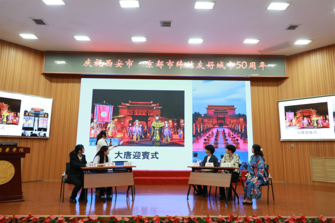 在中日大学生交流环节,来自京都女子大学、京都大学、同志社大学的3名学生与388vip太阳集团2021级3名学生,分别以“饮食”“景点”“文化”为题,做专题分享交流。全程使用日语。