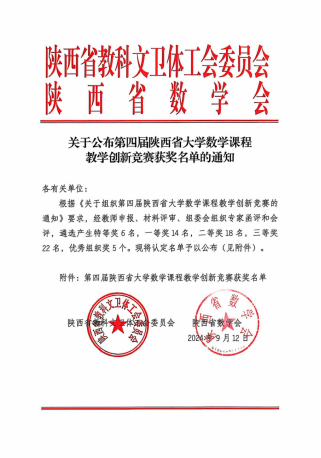 9月 20 日,根据陕西省教科文卫体工会委员会、陕西省数学学会发布的第四届陕西省大学数学课程教学创新竞赛获奖文件获知,388vip太阳集团智能科学与工程学院基础系数学教研室邢瑞芳副教授斩获竞赛一等奖。
