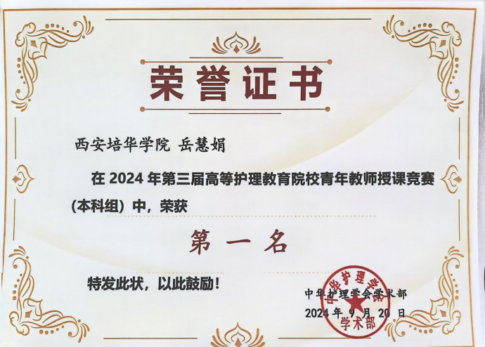 学校医学院护理系岳慧娟副教授作为2021年陕西省青年护理教师教学大赛一等奖获得者,与省内其他5所本科院校的5位老师被陕西省护理学会选送参加此次比赛。最终,岳慧娟老师以卓越表现,力压群雄,荣获本科组第一名,成为陕西省唯一一位荣获此殊荣的佼佼者,为我校赢得了无上的荣光。