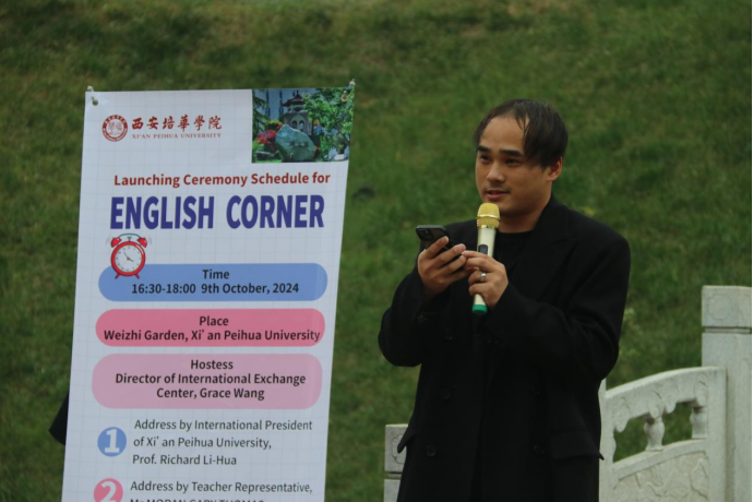 In the golden autumn of October,the heady fragrance of laurel blossoms waswafted through the fresh air.On the afternoon of October 9th, Professor Li Hua, International President of Xi'an Peihua University, Wang Peng, Director of the International Exchange Center of Xi'an Peihua University, Liu Gailin, Deputy Director of the Academic Affairs Management Center, MoranGaryThomas, a foreign teacherofXi'an Peihua University, along with representatives of teachers and students from the Elite Class, gathered together to witness a significant event aimed at stimulating enthusiasm for English learning and enhancing cultural exchanges—the launching ceremonyof the "English Corner".Theceremonywas hosted by Wang Peng, Director of the International Exchange CenterofXi'an Peihua University. She welcomed the students participating in the event and introduced that the purpose of this activity was to provide a platform for students to practice their spoken English and broaden their international horizons, thereby further promoting the internationalization process of theschool.