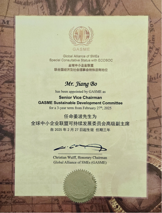 会上,姜波理事长受聘为全球中小企业联盟可持续发展委员会高级副主席,武尔夫先生为其颁发聘书。