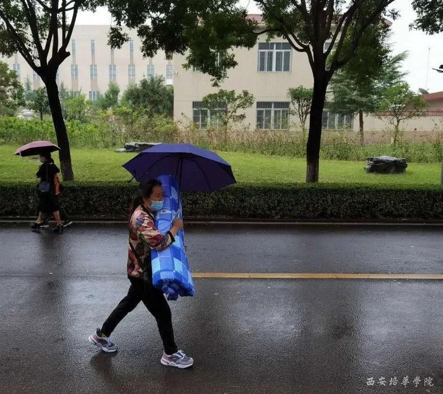 报到期间,天气一直下着雨,但这位母亲却一直把伞靠近褥子,对于这位母亲来说,自己淋雨也不能淋湿孩子的被褥。