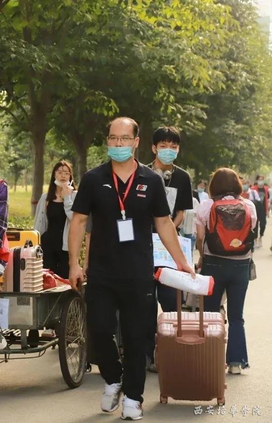 图片中的老师是体育学院副院长马老师,但若不是胸口的工作牌,估计和新生家长别无二致,替新生拉行李、答疑解惑……。对新生来说,他是老师,也是亲人,当父母把孩子交给老师,老师就担起责任,用心培育每一位学生。