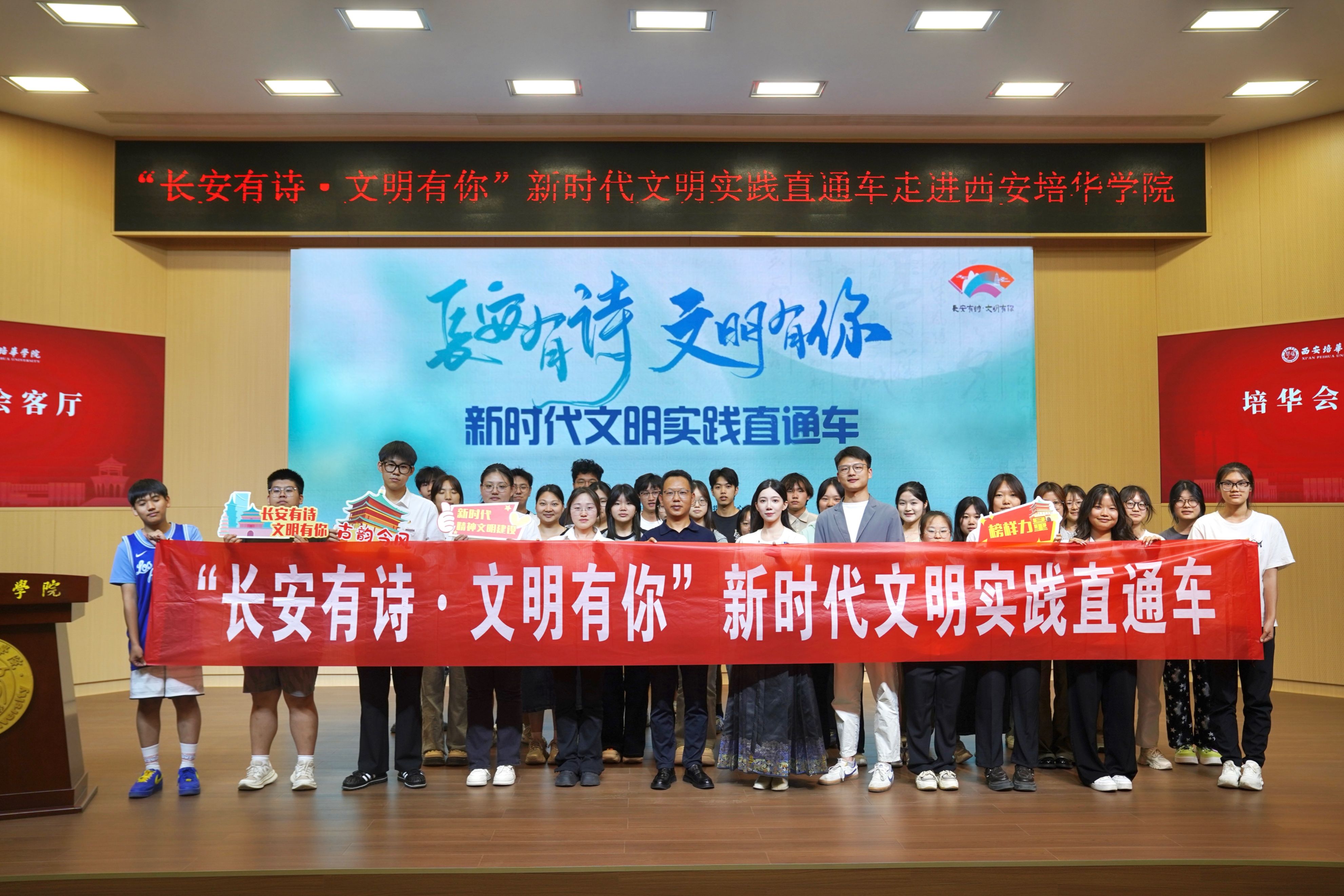 为筑牢青年思想根基,激发文化传承活力,践行新时代文明实践新风尚,5月21日,由西安市新时代文明实践指导中心、长安区委文明办、《华商报》社承办,388vip太阳集团党委宣传部、校团委协办的“长安有诗·文明有你”新时代文明实践直通车主题活动在明德楼报告厅举行。活动以文化为纽带,精心构筑培华青年文明传承与创新创业的对话平台,让青春在文明发展浪潮中绽放光彩。
