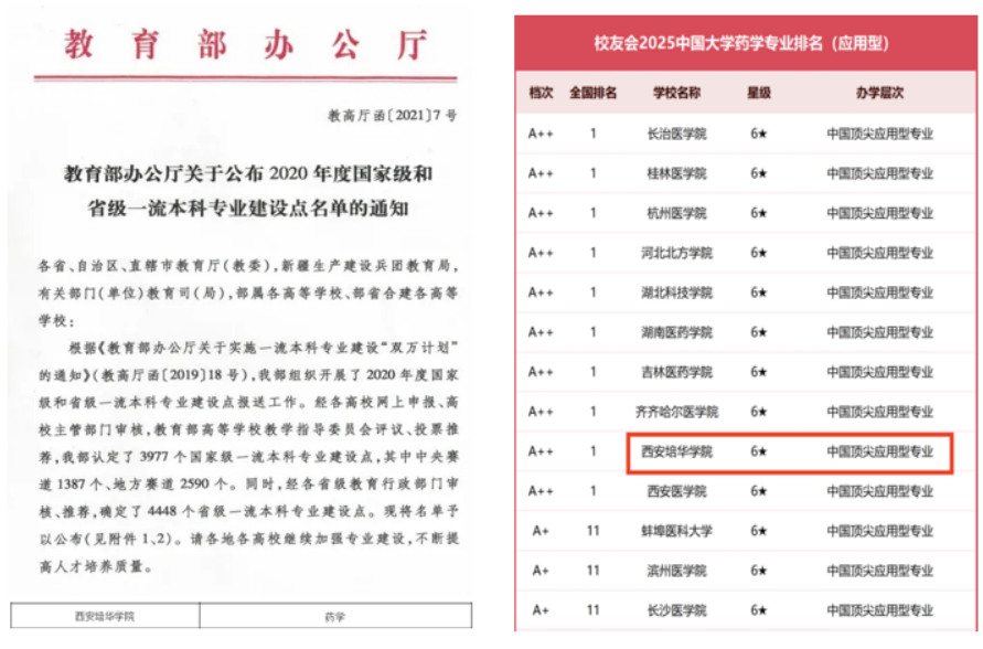 药学专业2020年获批省级一流本科建设专业,2021-2025年连续获评艾瑞深校友会中国顶尖应用型六星级专业