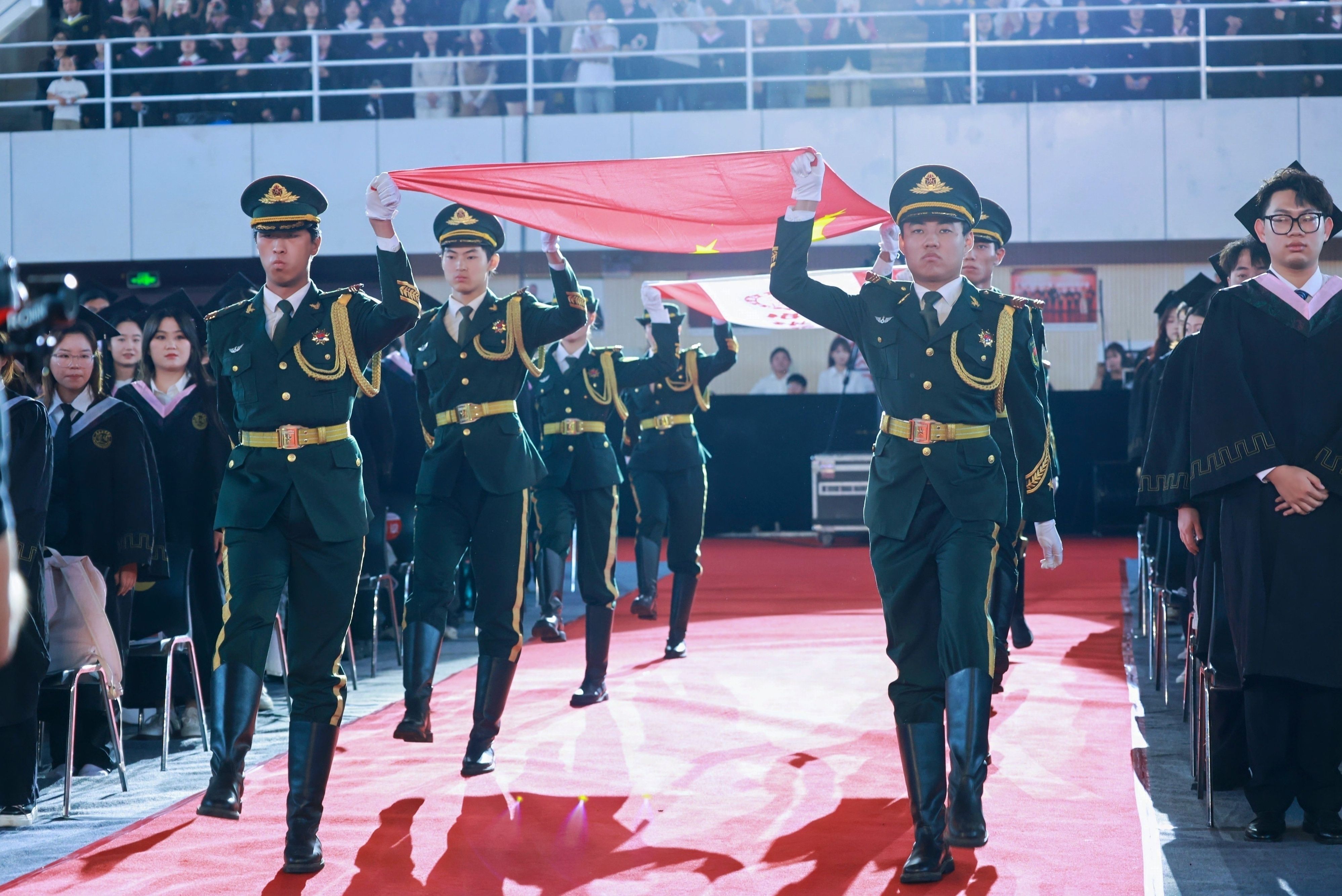国旗护卫队护旗手迈着铿锵有力的步伐,护卫着国旗和校旗庄严入场。全体师生肃立,目光紧随旗帜,胸中激荡着家国情怀与母校深情。