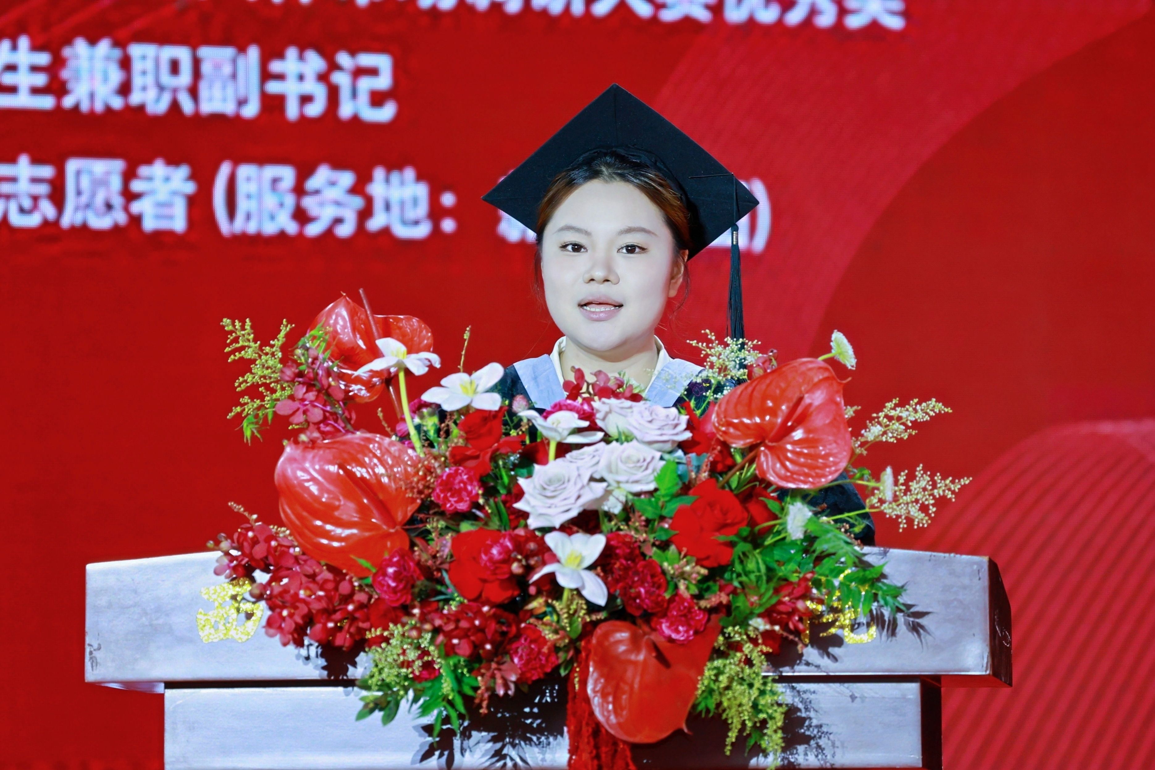 会计与金融学院毕业生、西部计划志愿者李建乐代表全体毕业生发言,她回顾了在培华的四年大学青春,感恩母校的培养,强调“知行合一”的重要性。她表示,自己已入选“大学生志愿服务西部计划”,将赴新疆生产建设兵团十二师从事基层工作,并以此号召全体毕业生牢记“校誉至上、质量第一、自强不息、开拓前进”的校训,像“蒲公英”一样扎根祖国需要的地方,让青春在奉献中闪光。
