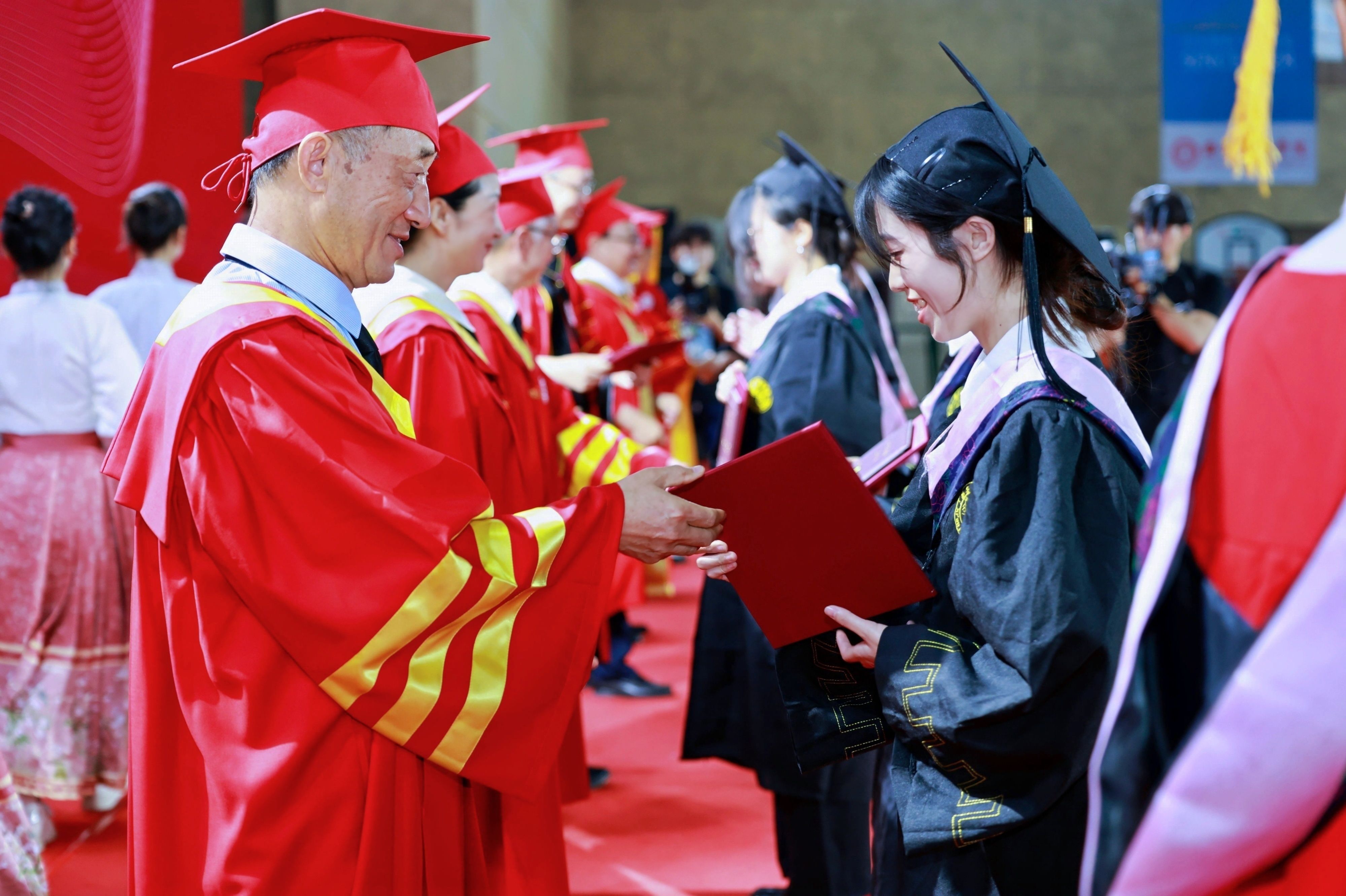 校领导们共同为毕业生代表颁发毕业证书、学位证书,并拨穗授礼。期间,毕业生代表们也送上了寓意美好的礼品,表达感激之情。