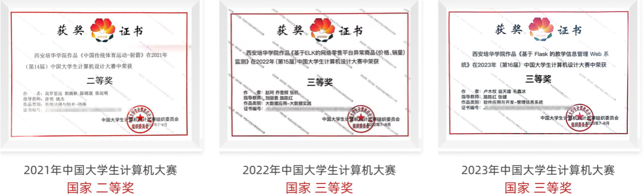 专业组织学生参加各类学科竞赛、科技创新竞赛,如中国大学生计算机设计大赛、蓝桥杯大赛、华为ICT大赛等权威赛事,与一流大学同台竞技,摘金夺银,屡获殊荣,荣获国家级、省级奖项共100余项。同时推行“1+X证书”制度,鼓励学生考取华为认证等职业资格证书,构建“学历+技能”双优势竞争力。