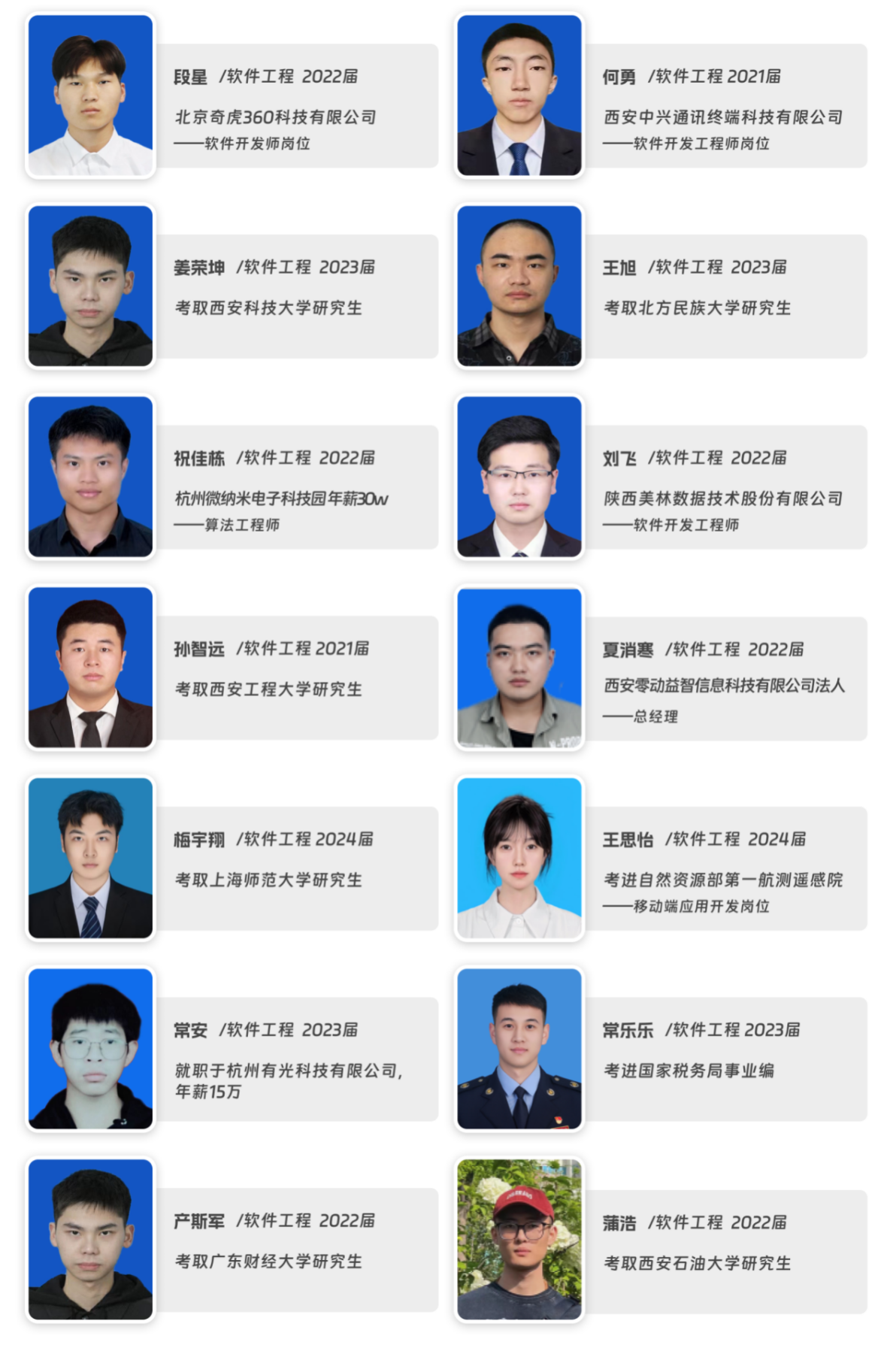 近三年来,毕业生就业率稳定在高位,就业岗位覆盖软件开发、项目管理等高需求领域。众多优秀学子入职行业龙头企业如中兴通讯、360科技有限公司、软通动力信息技术股份有限公司、美林数据技术股份有限公司等。考研率逐年提升,考取上海师范大学、南京工业大学、西安科技大学、西安石油大学、西安工程大学等,考研深造成果显著。考取事业编的学生也越来越多,如考取国家税务总局事业编、考进自然资源部第一航测遥感院等。