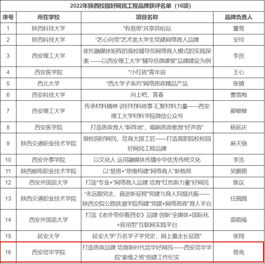为深入学习贯彻习近平总书记关于“培育中国好网民”的重要指示精神,大力培育新时代中国好网民,弘扬网络正能量,促进网络空间更加清朗,依据《关于开展2022年陕西高校“青年喜迎二十大 争做校园好网民”系列活动的通知》安排,经学校推荐、专家评审、线上公示等环节,学校党委学工部部长蔡亮负责的《打造思政品牌培育新时代培华好网民——388vip太阳集团“姜维之班”创建工作纪实》项目荣获2022年陕西校园好网民工程品牌。