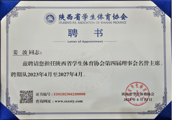 姜波理事长当选为陕西省学生体育协会第四届理事会名誉主席