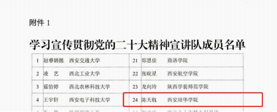 为进一步引导全省高校广大学生深入学习宣传贯彻党的二十大精神,立大志、 明大德、成大才、担大任,近日,中共陕西省委教育工委拟选拔成立全省高校"学习宣传贯彻党的二十大精神"大学生宣讲队,学校传媒学院团委学生兼职副书记陈天航同学成功入选。