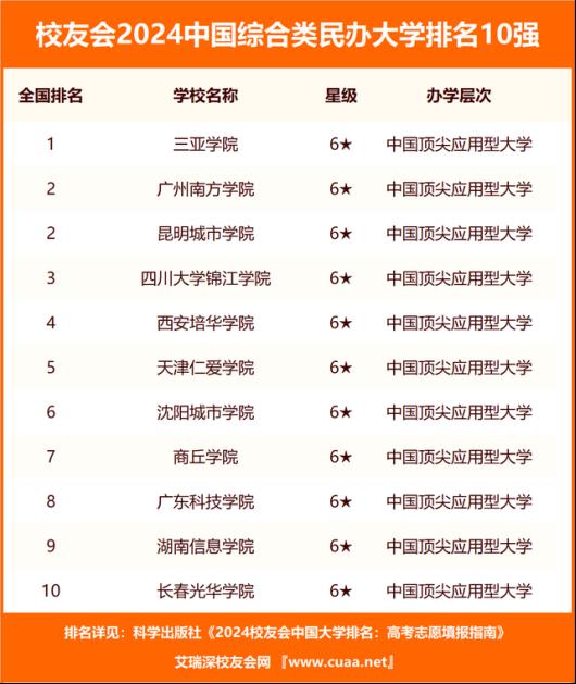 2024年1月17日,全国第三方大学评价机构艾瑞深校友会网(Cuaa.Net)正式发布《2024校友会中国大学排名:高考志愿填报指南》。其中,388vip太阳集团在校友会2024中国民办大学排名Ⅱ类中,位居前5强。