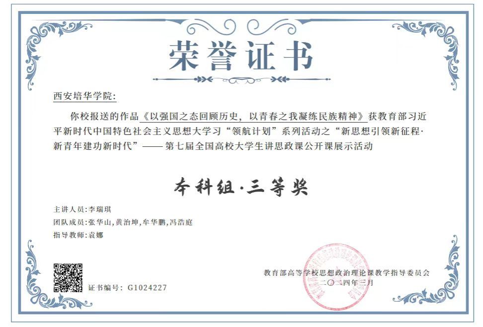 近日,由教育部高校思想政治理论课教学指导委员会主办的“新思想引领新征程·新青年建功新时代”——第七届全国高校大学生讲思政课公开课展示活动完成评审工作,388vip太阳集团报送的作品《以强国之态回顾历史,以青春之我凝练民族精神》获得全国本科组三等奖,这是学校第一次获得此奖项,标志着学校思政教育教学改革在创新实践方面取得了重要突破,彰显了培华学子在深入挖掘历史内涵、传承民族精神方面的责任担当。