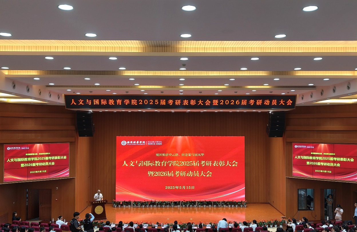 为助力学子深入了解考研动态,点燃备考热情,明晰发展方向,同时表彰考研优秀学子,营造优良学风,5月15日,人文与国际教育学院在图书馆报告厅召开2025届考研表彰大会暨2026届考研动员大会。学院院长梁蕊、党委书记南兵、科研副院长程世和、党委副书记高嘉炜及师生代表参加。会议由学院教学副院长栾博强主持。