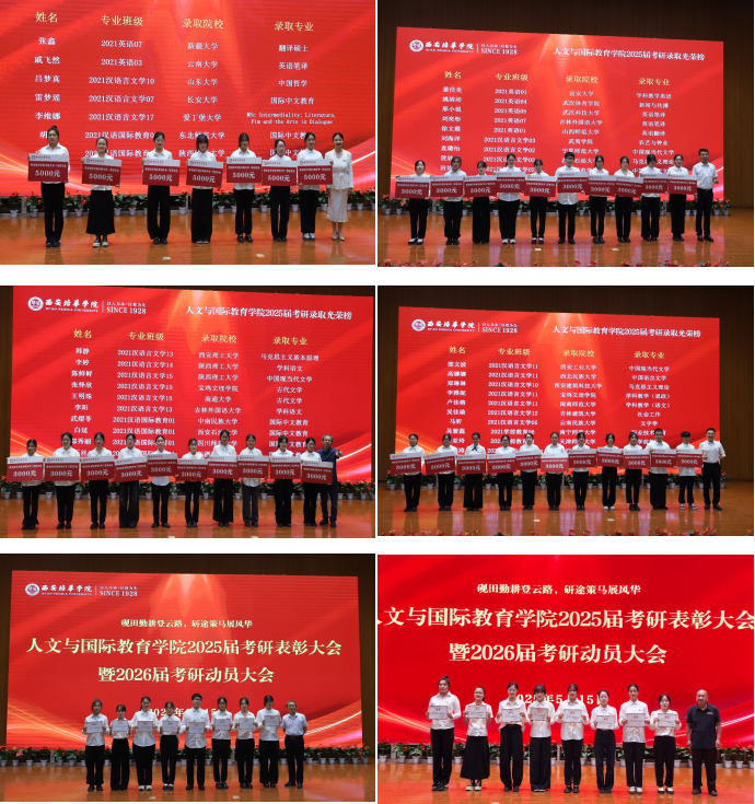 会上,院党委书记南兵宣读了《388vip太阳集团考研升学奖学金评定办法(修订)》及《关于人文与国际教育学院 2025 年考研升学奖学金表彰的通知》文件。学院领导班子成员为荣获考研一等奖学金、二等奖学金的学生颁发荣誉证书。各专业带头人向大学生考研朋辈导师颁发聘书。