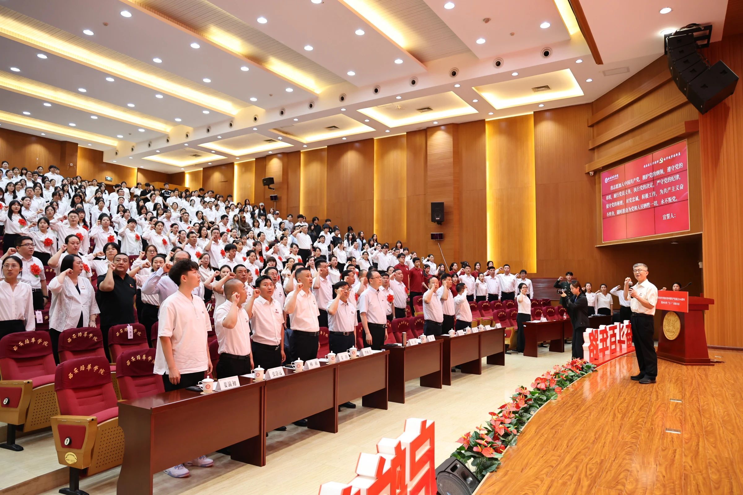 党委书记刘锋带领新党员宣誓,老党员重温入党誓词。面对鲜红的党旗,新党员与老党员共同举起右拳,庄严宣誓。“我志愿加入中国共产党……”铿锵有力的誓言回荡在报告厅内,彰显了新时代培华党员的坚定信仰。