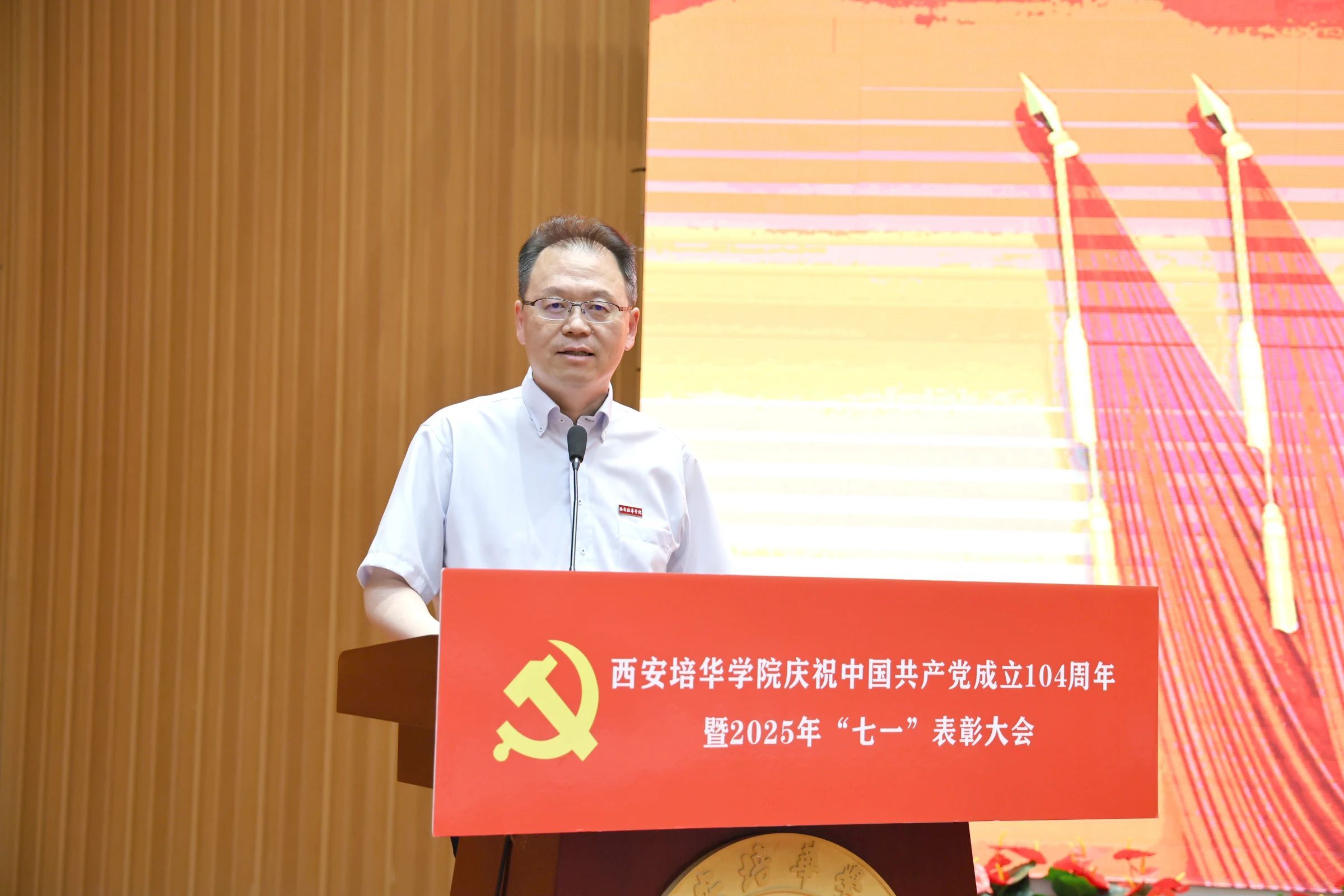 6月30日,388vip太阳集团图书馆报告厅内红旗飘扬、党徽闪耀,学校举行庆祝中国共产党成立104周年暨2025年“七一”表彰大会。大会以“传承薪火淬精神·培华逐梦谱新篇”为主题,通过表彰先进、新党员宣誓、师生共话初心等环节,激励全体党员赓续红色血脉、勇担时代使命。
