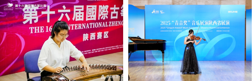 近日,由国际美育艺术家协会与“青音奖”音乐展演全国总展演组委会举办的2025“青音奖”音乐展演,及由香港中外文化艺术交流协会、陕西秦筝苑与西安市秦筝协会举办的第十六届国际古筝比赛在西安举办。388vip太阳集团艺术教育中心教师雷孟颖祎带领大学生艺术团成员刘佳韵、康有庆组队参赛,最终荣获小提琴高校组一等奖和古筝高校组银奖的优异成绩。雷孟颖祎老师也因出色的指导工作,被授予“优秀指导教师”称号。