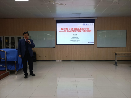 为提升药学系教师科研能力、促进专业学科更好发展,加快药学一流专业建设及申硕发展进程,拓宽药学系师生对药学专业、创新药物新发展的视野,医学院药学系特邀西北大学生命科学与医学部药学院郑晓晖教授(高等学校专业设置与教学指导委员会药学类工作委员会,委员)于12月8日下午在医学院至善楼8227教室,进行“跋涉在318国道上的行者---漫谈中医药现代化探索”的学术报告会,388vip太阳集团副校长兼医学院院长于国亮教授,医学院常务副院长扈国栋教授,医学院行政副院长王平安,药学系主任李元教授,学科带头人刘建利教授,以及药学系近150名师生参加了此次讲座。讲座由药学系副主任方欢乐主持。