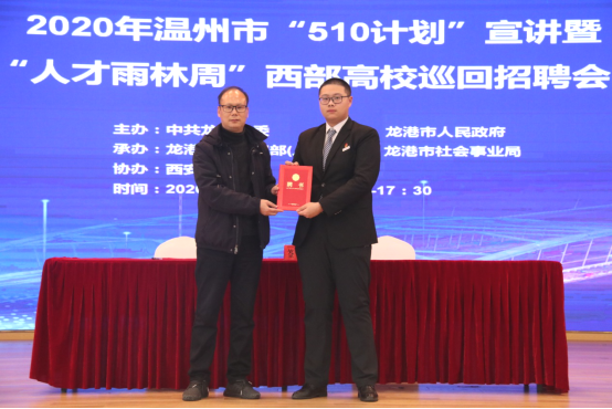 中共龙港市委组织部副部长章细仁向我校学生代表徐昊源颁发“高校引才大使”聘用证书