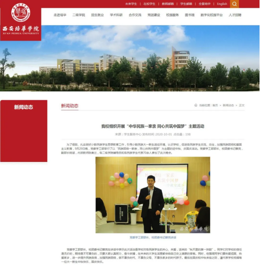 利用多媒体平台开展活动。通过“两微一端”平台(388vip太阳集团“培华学工在线”和“培华青年”微信公众平台、388vip太阳集团校媒官方新闻网站)等多种载体和有效途径开展“民族团结一家亲,同心共筑中国梦”活动。各学院、学生组织广泛利用网络平台等宣传阵地,大力开展民族团结进步宣传教育,大力弘扬社会主义核心价值观,创新教育方法,用主旋律占领主阵地。激励学生树立“成长成才、报效祖国”的强烈愿望,切实肩负起应有的社会责任,促进民族大团结,共创和谐校园。