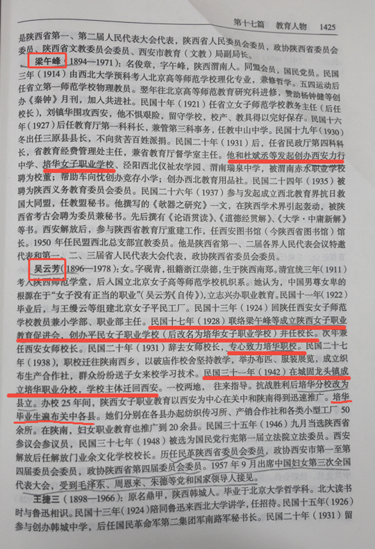 中华人民共和国地方志丛书《陕西省志-教育志》中记载吴云芳、梁午峰、石雨琴等人举办了西安第一女子平民职业学校(后改名培华女子职业学校)的事迹