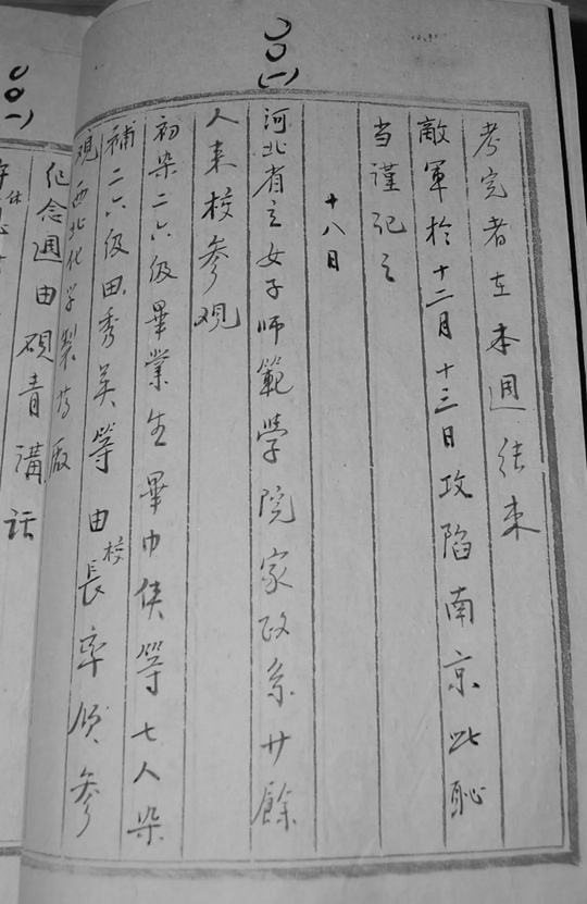 培华女职抗战时期的一页日志记录:“敌军于十二月十三日攻陷南京,此耻当谨记之”