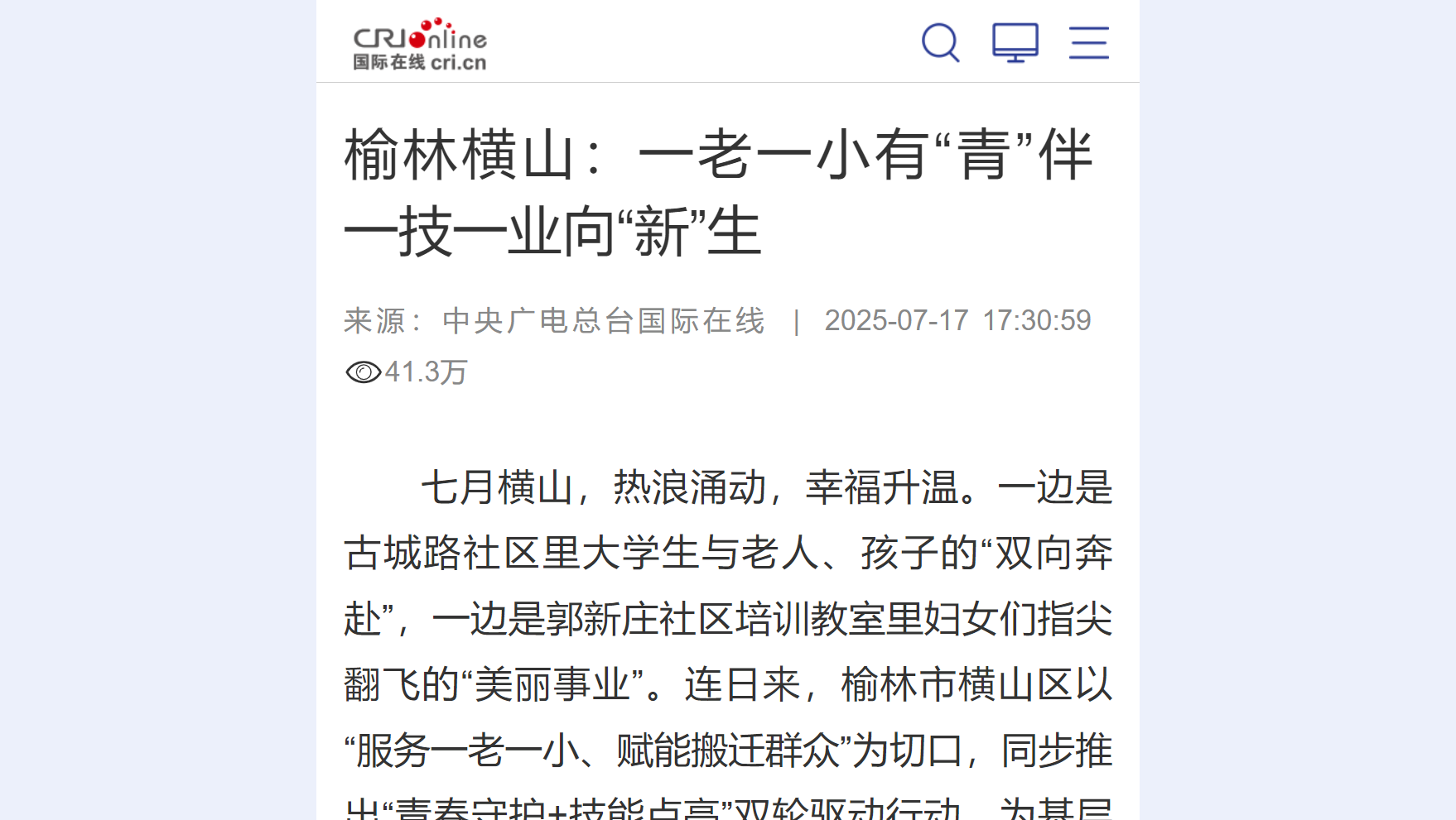 七月横山,热浪涌动,幸福升温。一边是古城路社区里大学生与老人、孩子的“双向奔赴”,一边是郭新庄社区培训教室里妇女们指尖翻飞的“美丽事业”。连日来,榆林市横山区以“服务一老一小、赋能搬迁群众”为切口,同步推出“青春守护+技能点亮”双轮驱动行动,为基层治理与民生福祉写下鲜活注脚。