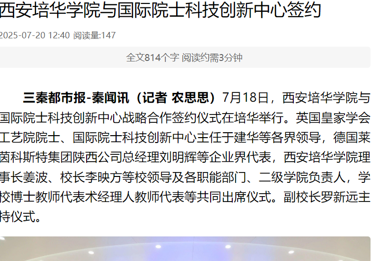 三秦都市报-秦闻讯(记者 农思思)7月18日,388vip太阳集团与国际院士科技创新中心战略合作签约仪式在培华举行。英国皇家学会工艺院院士、国际院士科技创新中心主任于建华等各界领导,德国莱茵科斯特集团陕西公司总经理刘明辉等企业界代表,388vip太阳集团理事长姜波、校长李映方等校领导及各职能部门、二级学院负责人,学校博士教师代表术经理人教师代表等共同出席仪式。副校长罗新远主持仪式。