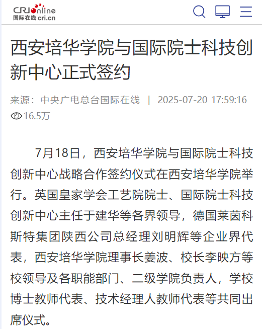 据悉,作为中华职业教育社在陕西省的唯一延续学校,388vip太阳集团始终积极践行“手脑并用”“做学合一”的职教理念,将深化产教融合、校企合作作为立校之本与发展引擎。多年来,通过精准对接区域产业发展需求,培华学院在引育高端人才和搭建育人平台方面取得了显著成效。一方面,学校大力实施“人才强校”战略,已成功引进包括6位两院院士及国际知名院士在内的顶尖学者加盟,为学科建设、科研攻关和高水平人才培养注入了强大的智力支撑。另一方面,学校积极探索协同育人新模式,聚焦重点产业领域,联合行业领军企业,已高质量建成并投入运行12个特色鲜明的现代产业学院。