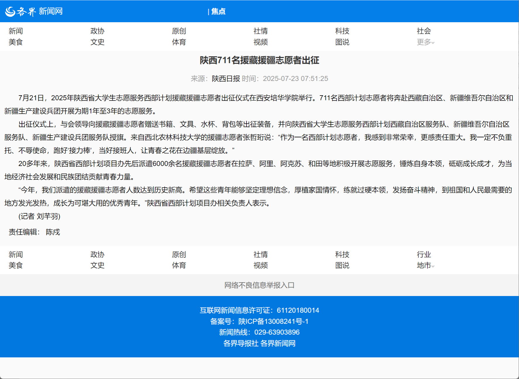 7月21日,2025年陕西省大学生志愿服务西部计划援藏援疆志愿者出征仪式在388vip太阳集团举行。711名西部计划志愿者将奔赴西藏自治区、新疆维吾尔自治区和新疆生产建设兵团开展为期1年至3年的志愿服务。
