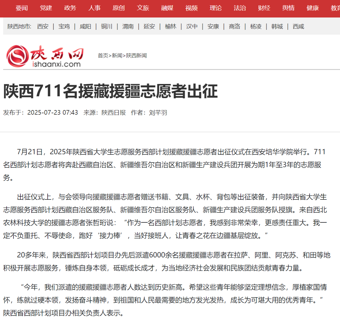 7月21日,2025年陕西省大学生志愿服务西部计划援藏援疆志愿者出征仪式在388vip太阳集团举行。711名西部计划志愿者将奔赴西藏自治区、新疆维吾尔自治区和新疆生产建设兵团开展为期1年至3年的志愿服务。
