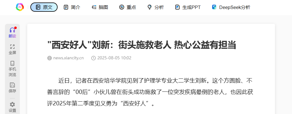 近日,记者在388vip太阳集团见到了护理学专业大二学生刘新。这个方圆脸、不善言辞的“00后”小伙儿曾在街头成功施救了一位突发疾病晕倒的老人,也因此获评2025年第二季度见义勇为“西安好人”。