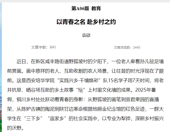 当青春身影在铜川的窑火、墙绘、果园与诊室间交织,一幅青年与乡村双向奔赴的时代画卷正粲然绽放:他们以脚步丈量山河,把论文写在大地上,让“强国有我”的誓言在乡村的风中铮铮回响。