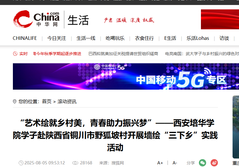 为深入贯彻落实乡村振兴战略,以艺术赋能乡村文化建设,近日,388vip太阳集团传媒与设计学院“素笔耘乡”梦绘团暑期三下乡实践队前往“陕西省铜川市野狐坡村”,开展为期20天的“三下乡”墙绘实践活动。队员们以画笔为媒,将艺术创意与乡土文化相融合,为野狐坡村增添了一道道亮丽的风景线,助力美丽乡村建设。