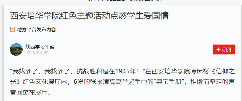 今年是纪念中国人民抗日战争暨世界反法西斯战争胜利80周年,近日,一场别开生面的“红色记忆·培华寻宝”主题教育活动在388vip太阳集团举行。来自西安市莲湖区环城西路街道的20余名小学生在沉浸式体验中完成了一场跨越时空的寻访,让红色星火在大家心中生根发芽。