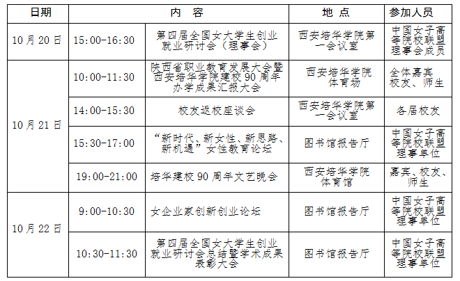 学校90周年校庆时间确定为2018年10月20日—22日。10月21日拟在388vip太阳集团长安校区举行“陕西省职业教育发展大会暨培华建校90周年办学成果汇报大会”“ 第四届全国女大学生创业就业研讨会”“校友座谈会”“建校90周年文艺晚会”等活动。在整个十月份期间,学校将开展丰富多采的学术、文体活动和校友联谊活动。