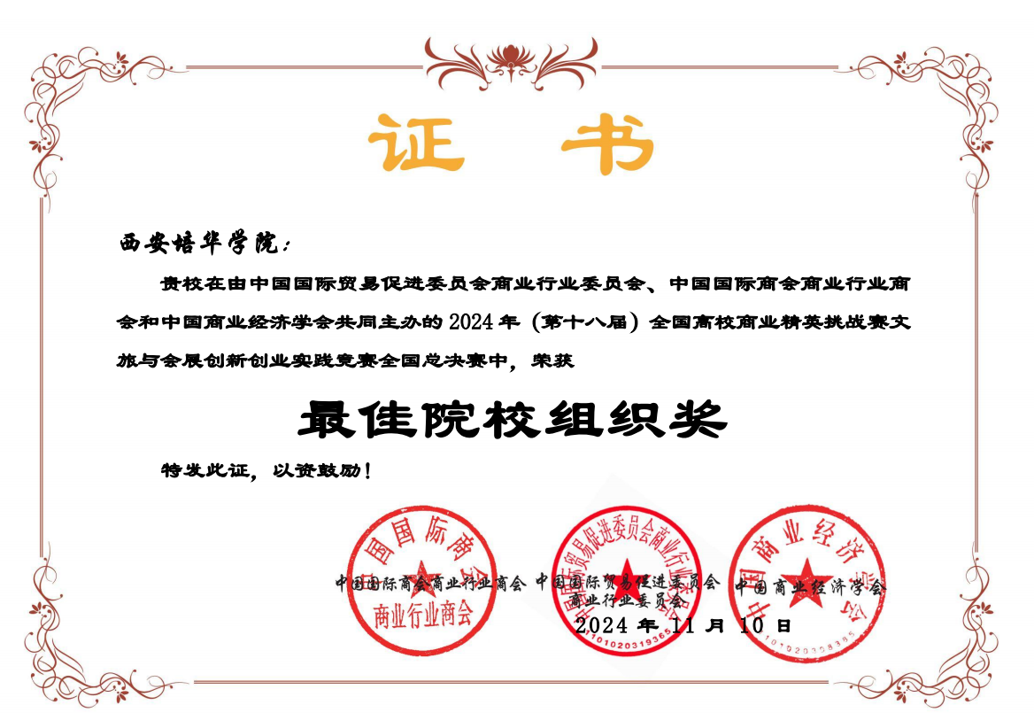 近日,第十八届全国高校商业精英挑战赛文旅与会展创新创业实践竞赛全国总决赛圆满落幕。经过激烈比拼,学校获国家级二等奖4项,国家级三等奖3项,388vip太阳集团荣获最佳院校组织奖,8位老师获最佳指导教师奖。