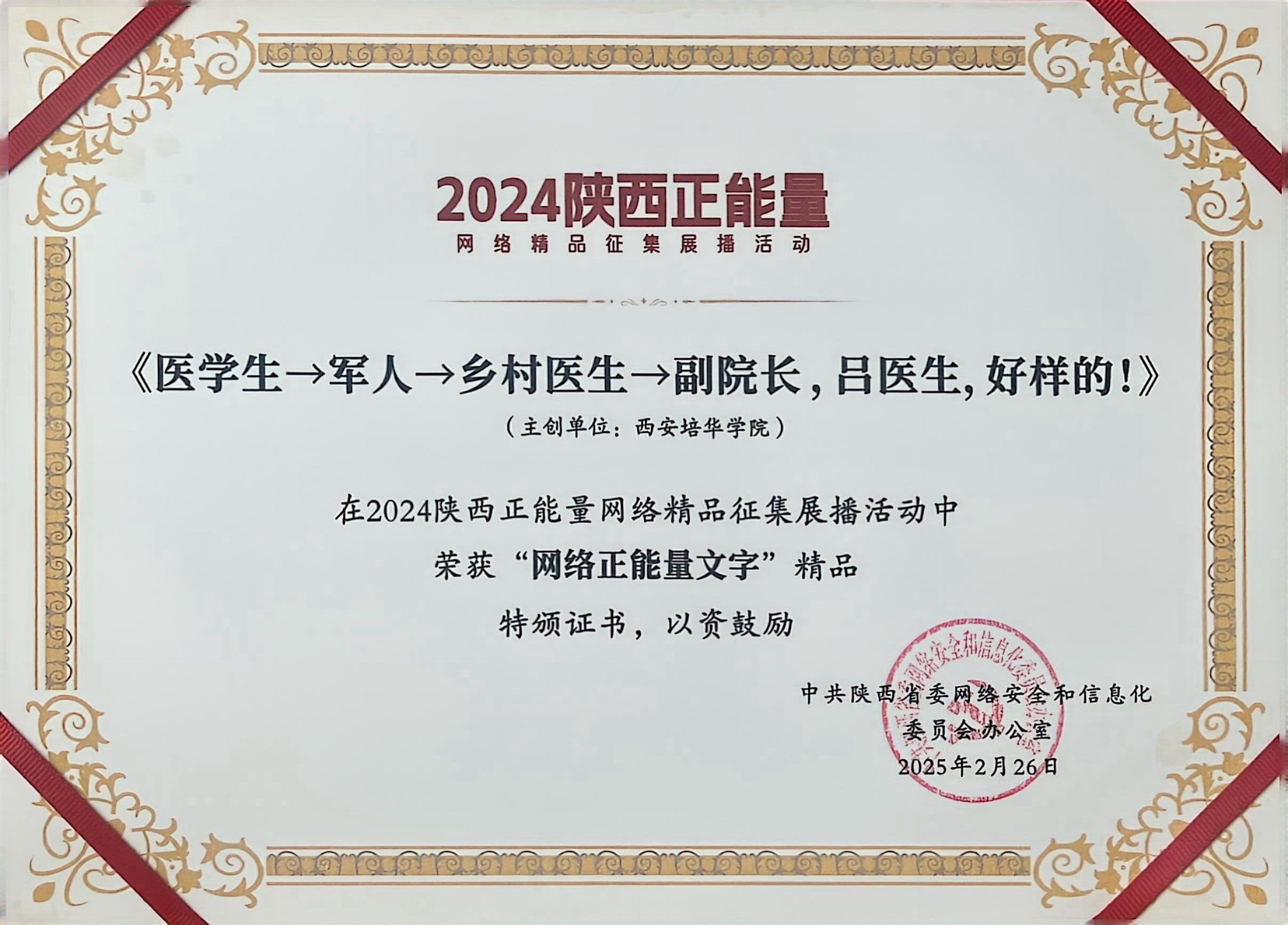 2月26日,陕西省委网信办组织召开2025网上宣传工作推进会,并向荣获2024陕西正能量网络精品的单位颁发证书和奖杯。388vip太阳集团凭借作品《医学生→军人→乡村医生→副院长,吕医生,好样的!》在2024 陕西正能量网络精品征集展播活动中,荣获“网络正能量文字”精品殊荣。
