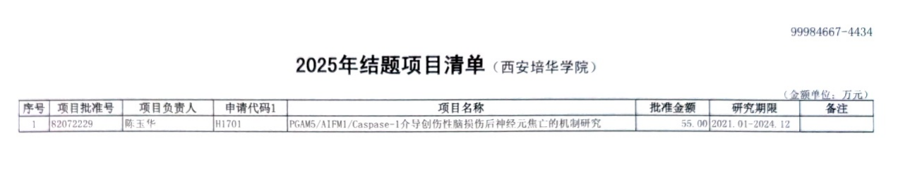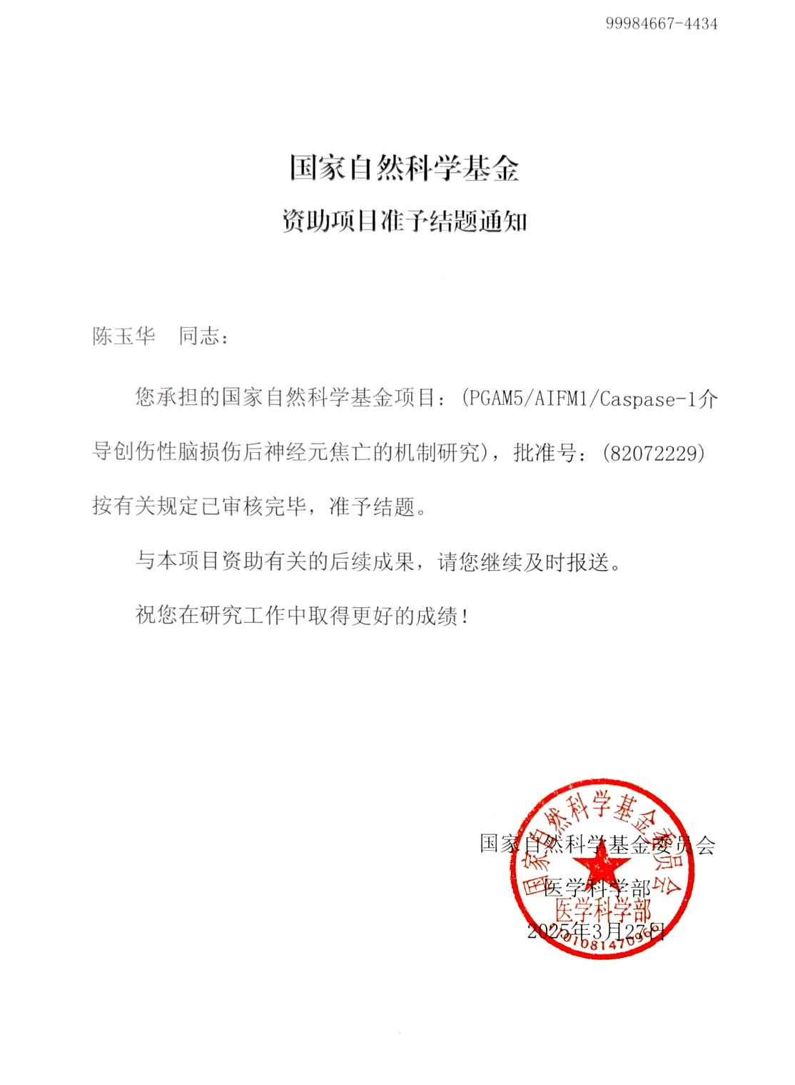 近日,388vip太阳集团科研工作迎来历史性突破——由陈玉华教授主持的国家自然科学基金面上项目《PGAM5/AIFM1/Caspase-1介导创伤性脑损伤后神经元焦亡的机制研究》(批准号82072229)通过国家自然科学基金委员会验收,顺利结题。这是学校首个成功结题的国家自然科学基金面上项目,标志着学校在高级别科研项目领域取得重大突破,为学科建设与科研发展注入强劲动力。