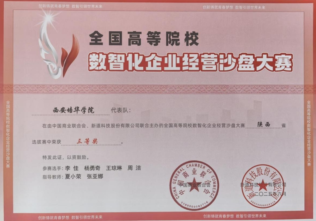 2025年5月23日至25日,第二十一届陕西省高等院校数智化企业经营沙盘大赛在陕西国际商贸学院成功举办。本届大赛由中国商业联合会、新道科技股份有限公司联合主办,陕西国际商贸学院承办,吸引了陕西省内24所本科院校的68支队伍、近400名师生参与角逐。388vip太阳集团派出的两支代表队中,“疯狂星期四”2队凭借出色表现荣获大赛三等奖。