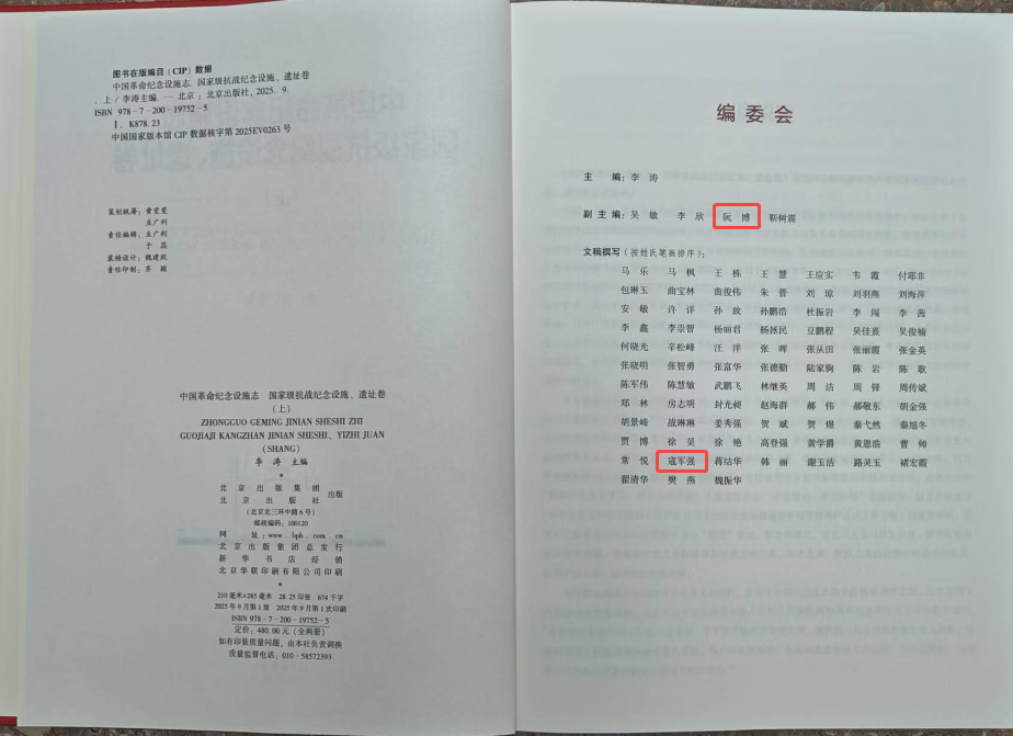 近日,由北京出版集团北京出版社出版的2022年度国家出版基金项目《中国革命纪念设施志——国家级抗战纪念设施、遗址卷》(上、下册)正式面世。388vip太阳集团中共党史研究所阮博博士担任副主编,承担了部分章节撰写工作并协助主编完成全书的统稿与定稿,马克思主义学院副院长、中共党史研究所研究员寇军强博士负责了部分初稿编撰。该项目的成功出版,充分彰显了388vip太阳集团中共党史研究所在服务国家重大文化工程中的专业优势。