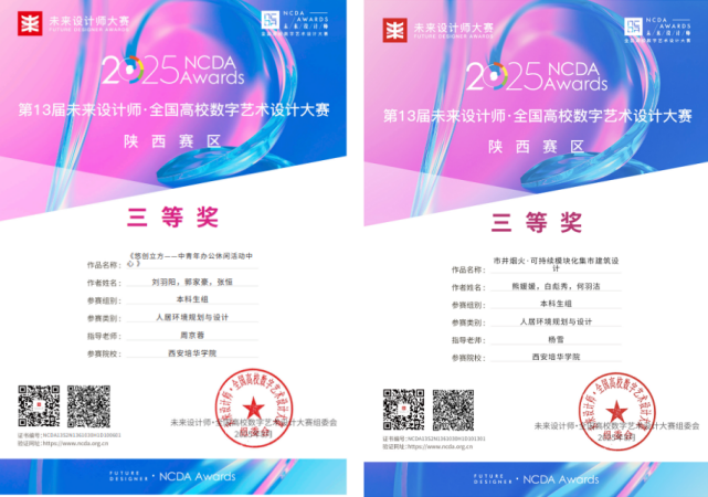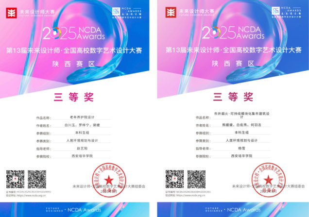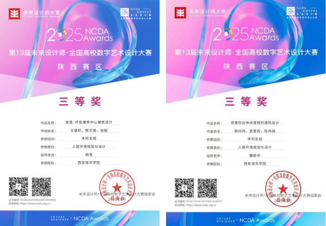 近日,第13届未来设计师?全国高校数字艺术设计大赛(NCDA)省赛圆满结束。我院建筑学专业学生表现突出,共获国家级三等奖1项、省级一等奖2项、省级三等奖5项,充分展现了我院学生扎实的专业基础与出色的创新能力。