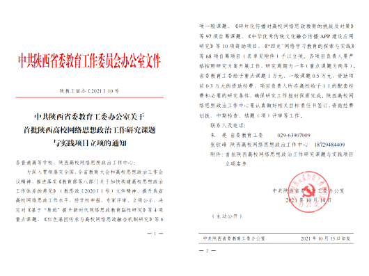 为深入贯彻落实全国、全省教育大会和高校思想政治工作会议精神,提升陕西省高校网络思政工作水平,经学校申报、专家评审、立项公示,中共陕西省委教育工委发布《关于首批陕西高校网络思想政治工作研究课题与实践项目立项的通知》,决定对重点课题及项目予以立项。