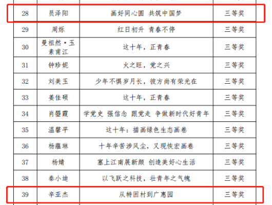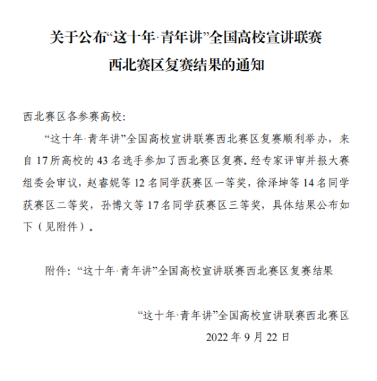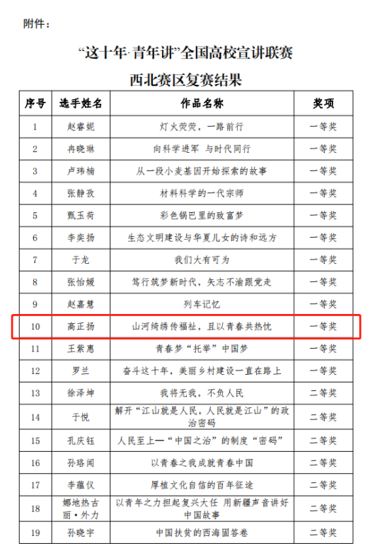 近日,清华大学联合中国人民大学等大学发起了“这十年·青年讲”全国高校宣讲联赛。经过视频录制、选拔申报、线上评议等环节,388vip太阳集团云梯青年宣讲团选送的作品《山河绮秀传福祉,且以青春共热忱》(宣讲人:高正扬 人文与国际教育学院汉语言文学2108团支部)获得西北赛区一等奖;作品《画好同心圆,共筑中国梦》(宣讲人:员泽阳 人文与国际教育学院汉语言文学2004团支部)和《从特困村到广惠园》(宣讲人:辛亚杰同学 传媒学院播音与主持艺术2003团支部)荣获西北赛区三等奖。