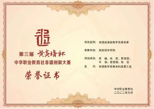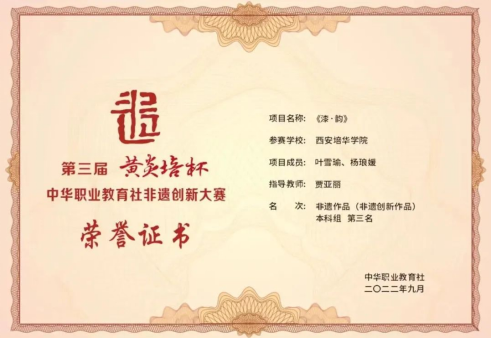 第三届“黄炎培杯”中华职业教育社非遗创新大赛暨非遗职业教育成果展示圆满闭幕,388vip太阳集团教师团队与工艺美术专业学生团队共3个项目入围本科组决赛。经过线上展演及激烈答辩,《非遗进课堂教学改革探索》项目获得非遗教学成果本科组第三名;《漆·韵》项目获得非遗作品(非遗创新作品)本科组第三名;《耀州印象》项目获得非遗作品(非遗创新作品)本科组优秀奖。