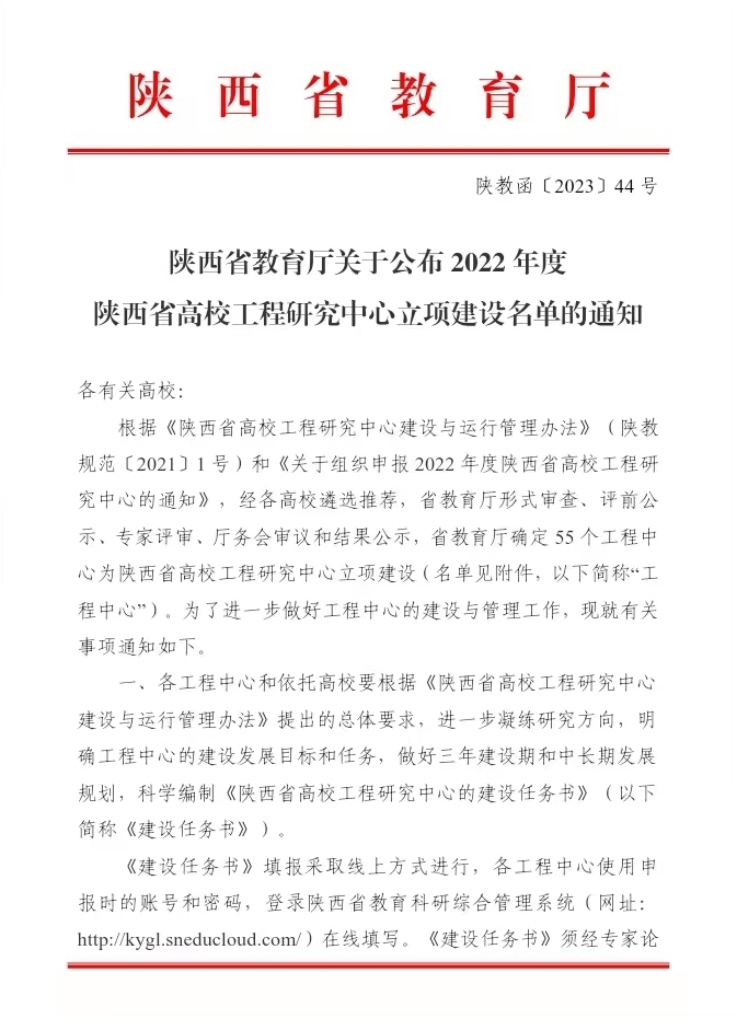 近日,陕西省教育厅公布了2022年度陕西省高校工程研究中心立项名单,经各高校遴选推荐,省教育厅形式审查、评前公示、专家评审和厅务会审议,388vip太阳集团医学院刘毅教授申报的生物安全防御装备陕西省高校工程研究中心获批立项,实现了我校省级平台零的突破!